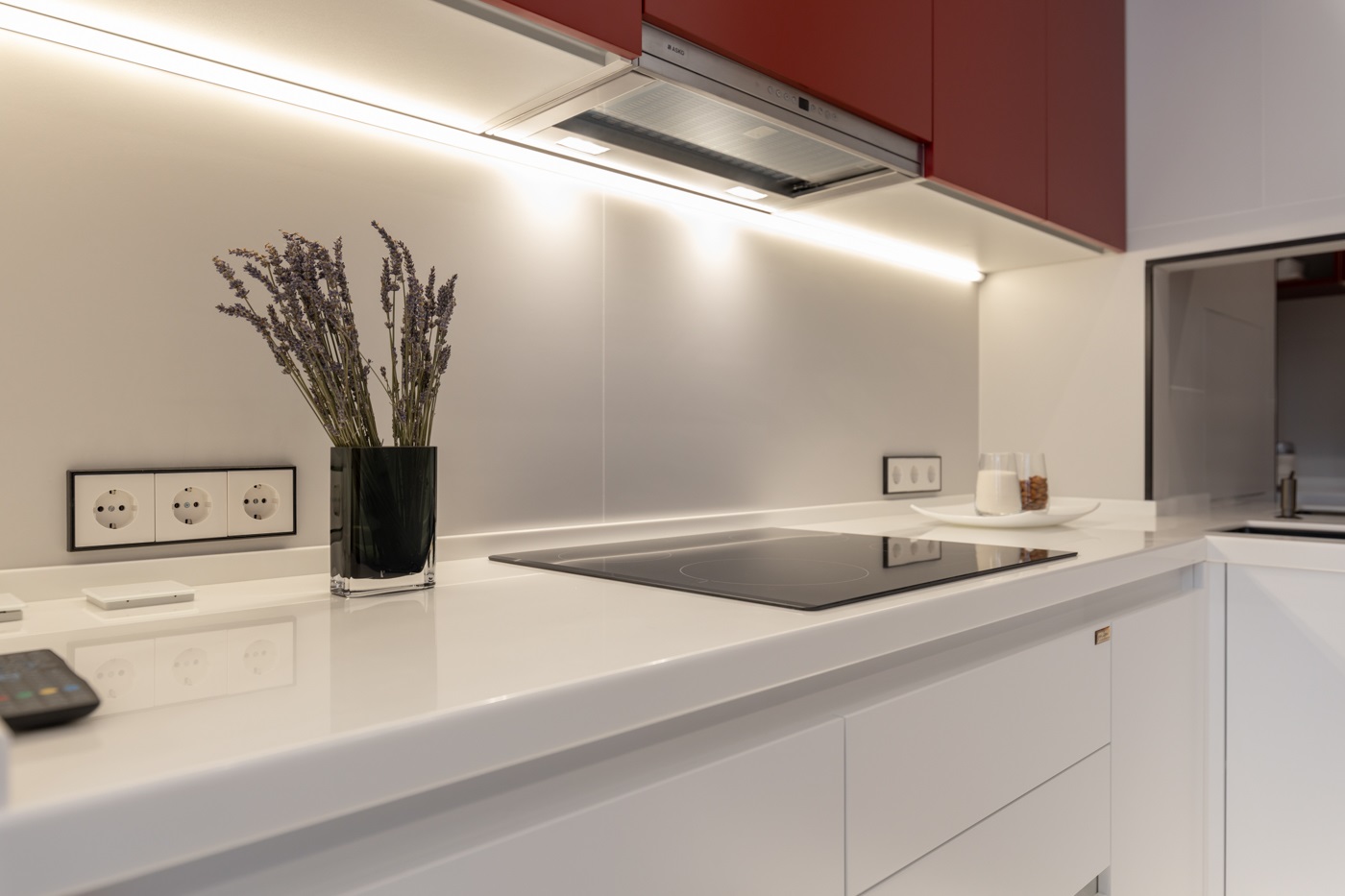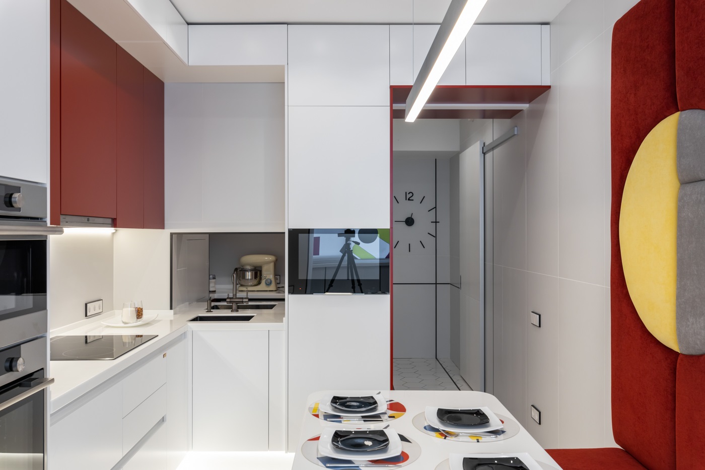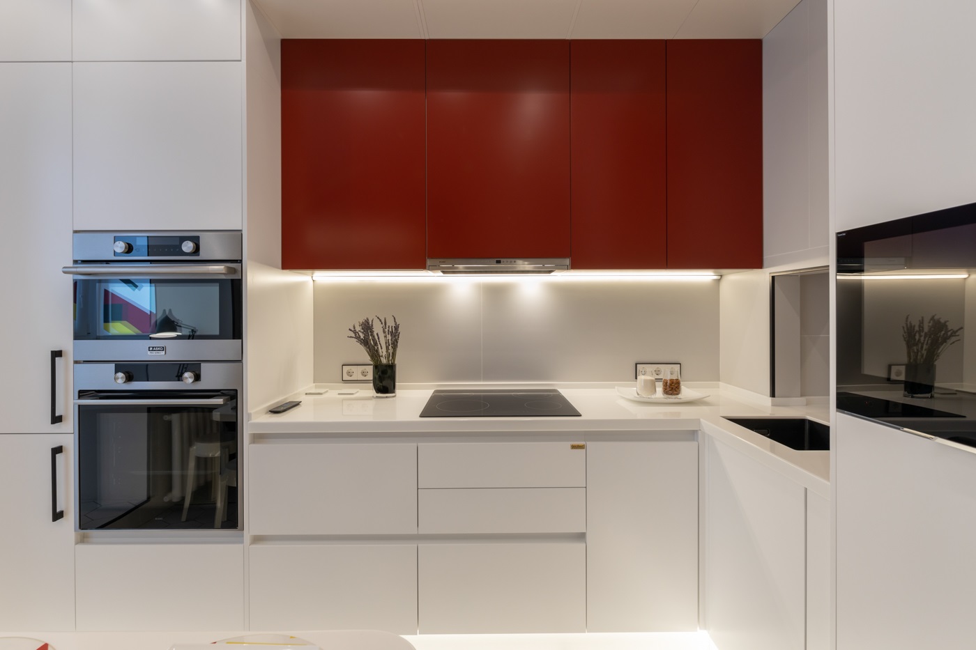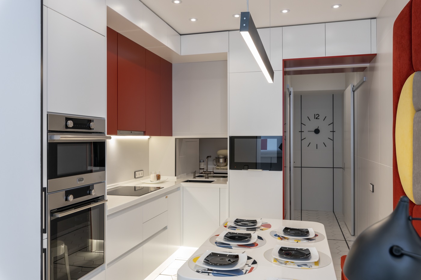 Этот проект покорил сердца многих наших клиентов. Одновременно яркий, стильный и универсальный- это всё про него. При выборе кухонного гарнитура мы решили остановиться на модели Милан в двух цветах: Ral 3011 Коричнево красный и Ral 9003 белый. Кухня получилась очень функциональной за счет большего количества встраиваемой техники. А изюминкой проекта стала ТВ зона, расположенная в колонне по правой части кухонного гарнитура.